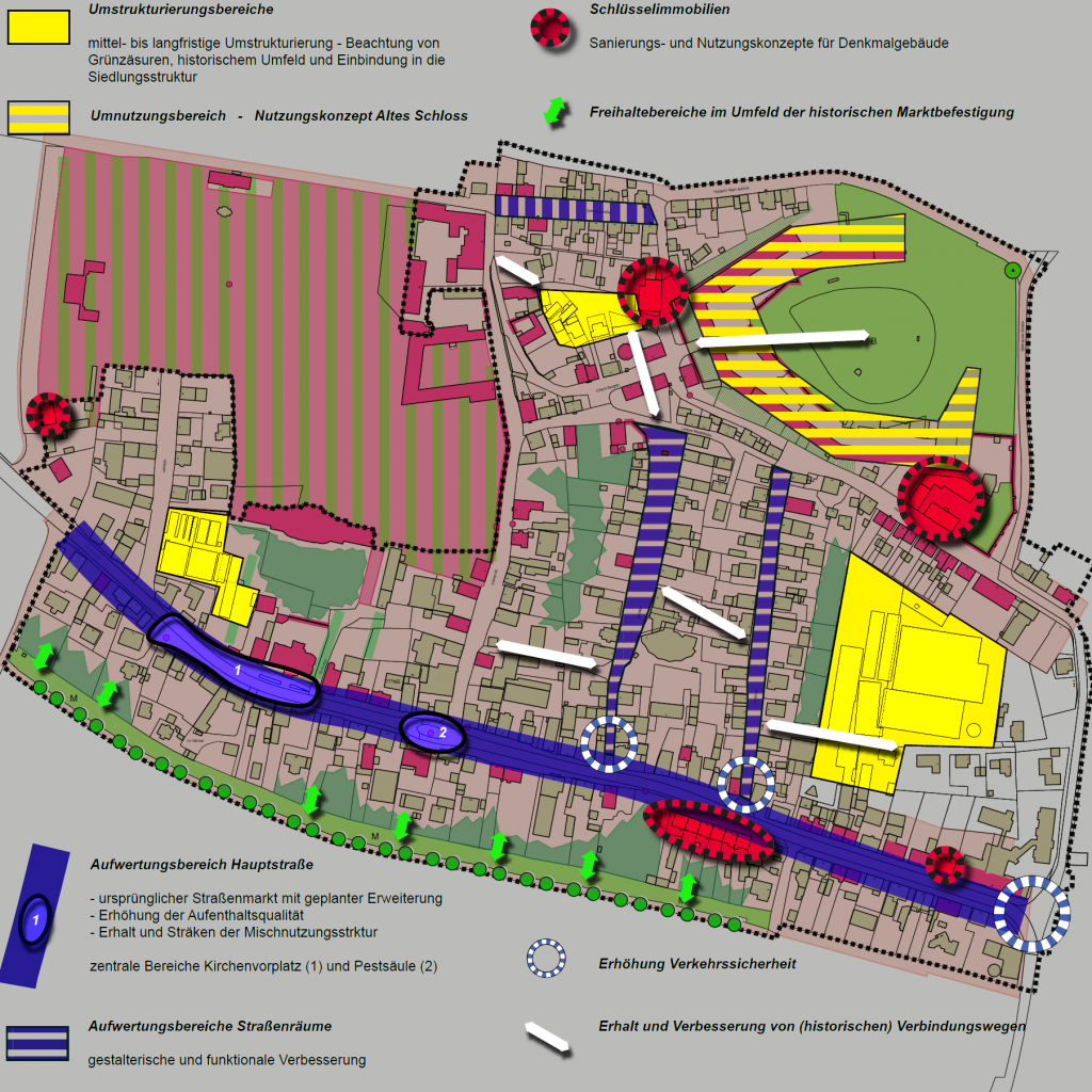 Zielkarte zum Erhalt der Nutzung und Weiterentwicklung denkmalgeschützter sowie historisch wertvoller Gebäude und Raumsituationen